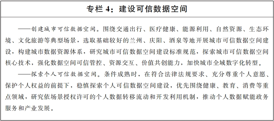 (十一)建設(shè)公共數(shù)據(jù)流通利用基礎(chǔ)設(shè)施。根據(jù)國家政策文件規(guī)定,探索城市、個(gè)人等可信數(shù)據(jù)空間建設(shè),鼓勵(lì)建設(shè)數(shù)聯(lián)網(wǎng)、數(shù)據(jù)元件等數(shù)據(jù)流通基礎(chǔ)設(shè)施,促進(jìn)數(shù)據(jù)高效便利可信流通。圍繞工業(yè)制造、現(xiàn)代農(nóng)業(yè)、醫(yī)療健康、綠色低碳等重點(diǎn)行業(yè)領(lǐng)域,探索數(shù)據(jù)基礎(chǔ)設(shè)施技術(shù)路線試驗(yàn),為國家數(shù)據(jù)基礎(chǔ)設(shè)施建設(shè)貢獻(xiàn)“甘肅方案”。推動(dòng)省內(nèi)數(shù)據(jù)基礎(chǔ)設(shè)施規(guī)則、管理、標(biāo)準(zhǔn)相通相容,促進(jìn)跨區(qū)域跨層級(jí)設(shè)施互聯(lián)、能力互通,實(shí)現(xiàn)數(shù)據(jù)利用方式向共享匯聚和應(yīng)用服務(wù)能力并重的方向轉(zhuǎn)變。