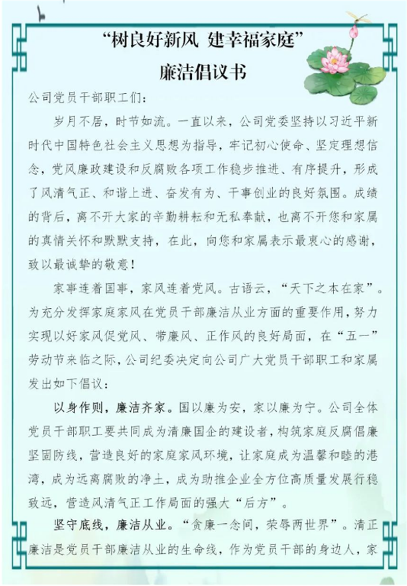 集團公司把家風建設作為廉潔文化建設的重要一環(huán),結合文明家庭創(chuàng)建,開展家庭助廉教育,以家風促作風,以親情促廉情。