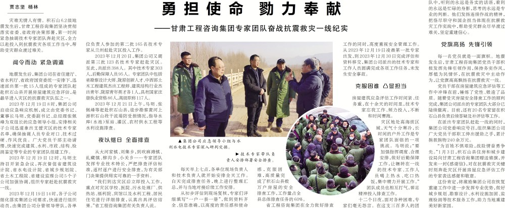 1月15日,《甘肅日報(bào)》第4版刊載《勇?lián)姑?勠力奉獻(xiàn)——甘肅工程咨詢集團(tuán)專家團(tuán)隊(duì)奮戰(zhàn)抗震救災(zāi)一線紀(jì)實(shí)》。該報(bào)道全面反映了集團(tuán)公司黨委心系災(zāi)區(qū)、聞令而動的一系列擔(dān)當(dāng)作為務(wù)實(shí)舉措,深度展現(xiàn)了專家團(tuán)隊(duì)和干部職工向險而行、甘于奉獻(xiàn)的抗震救災(zāi)生動實(shí)踐,進(jìn)一步凝聚起奮力奪取抗震救災(zāi)全面勝利的強(qiáng)大力量。