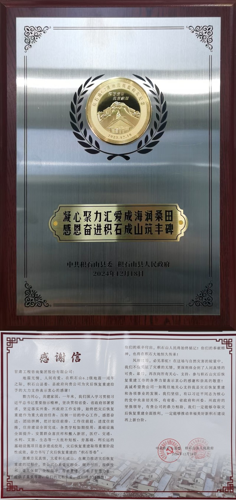 1月22日,時(shí)值北方農(nóng)歷小年。中共積石山縣委、積石山縣人民政府為甘肅工程咨詢集團(tuán)送來(lái)感謝信,對(duì)甘肅工程咨詢集團(tuán)在災(zāi)后恢復(fù)重建給予的大力支持表示感謝,并致以節(jié)日問(wèn)候。