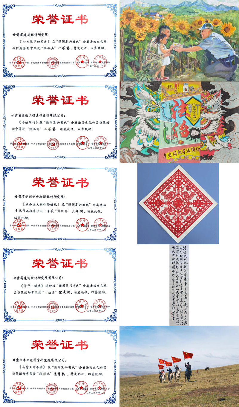 經(jīng)評選,集團(tuán)多件作品脫穎而出。省建筑設(shè)計院的《向日葵下的約定》以細(xì)膩筆觸和獨(dú)特視角,獲繪畫類一等獎;省交通監(jiān)理公司的《與法同行》生動展現(xiàn)法治守護(hù),獲繪畫類二等獎;省水電設(shè)計院的《社會主義核心價值觀》以精湛剪紙技藝,獲剪紙類三等獎;省建筑設(shè)計院的《〈管子·明法〉選抄》獲書法類優(yōu)秀獎;甘肅土木工程院的《馬背上的普法》獲攝影類優(yōu)秀獎。