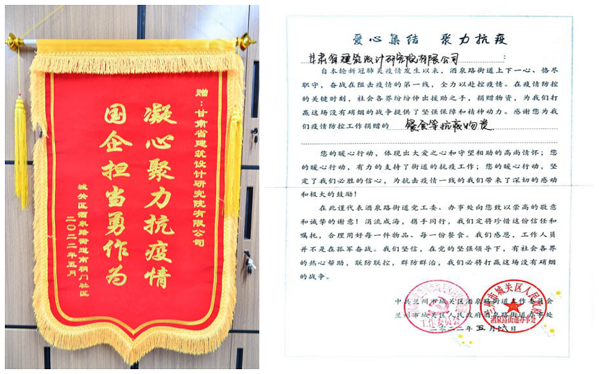 5月16日,甘肅省建筑設(shè)計(jì)研究院有限公司收到了來(lái)自蘭州市城關(guān)區(qū)酒泉路街道送來(lái)的感謝錦旗,錦旗上書(shū)寫(xiě)著“凝心聚力抗疫情 國(guó)企擔(dān)當(dāng)勇作為”。建筑設(shè)計(jì)院黨委書(shū)記李向軍、總經(jīng)理曹慶、紀(jì)委書(shū)記丁永升及黨群工作部相關(guān)負(fù)責(zé)人接待來(lái)訪。