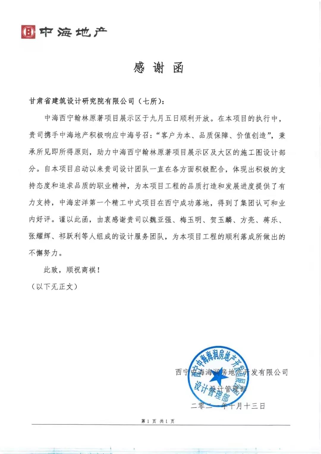 日前,建筑設(shè)計(jì)院收到來(lái)自西寧中海地產(chǎn)的一封感謝信,贊揚(yáng)設(shè)計(jì)七所魏亞強(qiáng)、梅玉明、賀玉麟、方亮、蔣樂、張耀輝、祁躍利組成的設(shè)計(jì)團(tuán)隊(duì)在中海西寧翰林原著項(xiàng)目展示區(qū)及大區(qū)施工設(shè)計(jì)中的突出表現(xiàn)。