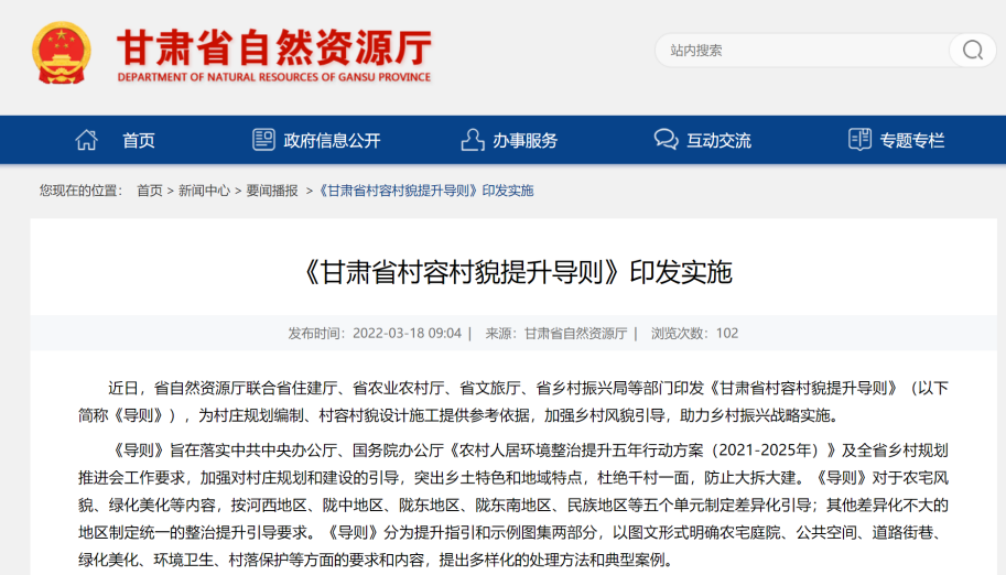 為進一步貫徹落實中共中央辦公廳、國務(wù)院辦公廳《農(nóng)村人居環(huán)境整治提升五年行動方案(2021—2025年)》及全省鄉(xiāng)村規(guī)劃推進會精神,由甘肅省城鄉(xiāng)規(guī)劃設(shè)計研究院有限公司牽頭,聯(lián)合甘肅省建筑設(shè)計研究院有限公司、西北師范大學(xué)城市規(guī)劃與旅游景觀設(shè)計研究院編制的《甘肅省村容村貌提升導(dǎo)則(試行)》(以下簡稱《導(dǎo)則》),于3月18日由省自然資源廳、省住建廳、省農(nóng)業(yè)農(nóng)村廳、省文旅廳、省鄉(xiāng)村振興局等五部門聯(lián)合印發(fā)?!秾?dǎo)則》的發(fā)布為全省村莊規(guī)劃編制工作提供了參考依據(jù),是推進鄉(xiāng)村振興戰(zhàn)略實施的重要抓手,是改善我省農(nóng)村人居環(huán)境、建設(shè)美麗甘肅的核心引導(dǎo),將在規(guī)范我省村容村貌提升、弘揚傳統(tǒng)文化、突出鄉(xiāng)土特色和地域特點,杜絕千村一面,防止大拆大建等方面發(fā)揮重要作用。