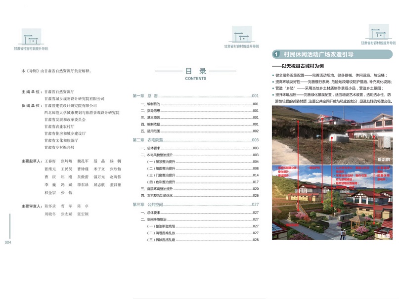 《導(dǎo)則》成果分為提升指引和示例圖集兩部分。提升指引部分以文字形式明確了甘肅省村容村貌整治提升的要求和內(nèi)容,包括總則、農(nóng)宅院落、公共空間、道路街巷、綠化美化、環(huán)境衛(wèi)生、村落保護、保障機制和附錄等9個章節(jié),對全省5個國家級歷史文化名村和54個傳統(tǒng)村落實行特殊保護;示例圖集部分以圖文形式提出了村容村貌提升的多種、可選處理方法和典型案例,主要包括農(nóng)宅院落、公共空間、道路街巷、綠化美化、環(huán)境衛(wèi)生、村落保護等6部分內(nèi)容。