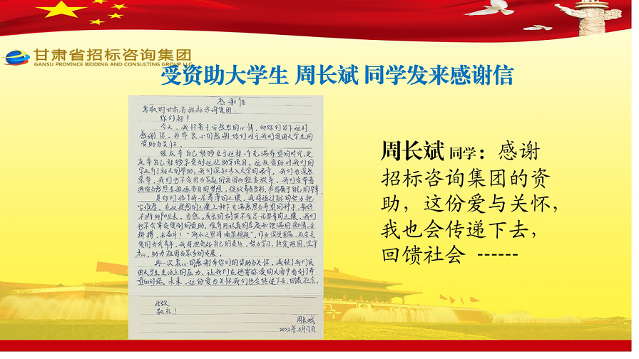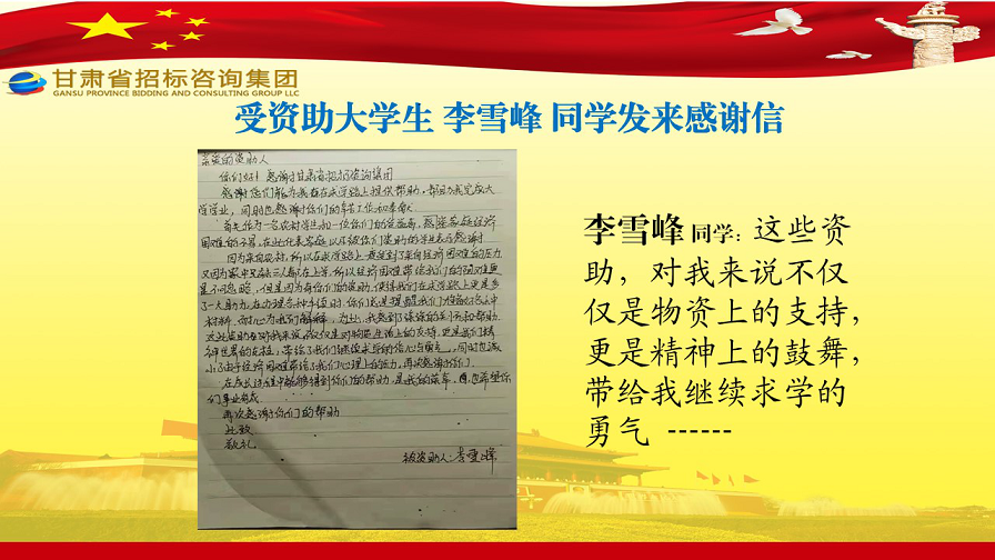 近日,張家川縣張棉驛鄉(xiāng)張棉村貧困大學(xué)生代表劉國(guó)熙、周長(zhǎng)斌、李雪峰等向甘肅省招標(biāo)咨詢(xún)集團(tuán)有限責(zé)任公司發(fā)來(lái)感謝信,就招標(biāo)咨詢(xún)集團(tuán)給予學(xué)費(fèi)資助一事表達(dá)他們的感激之情。
