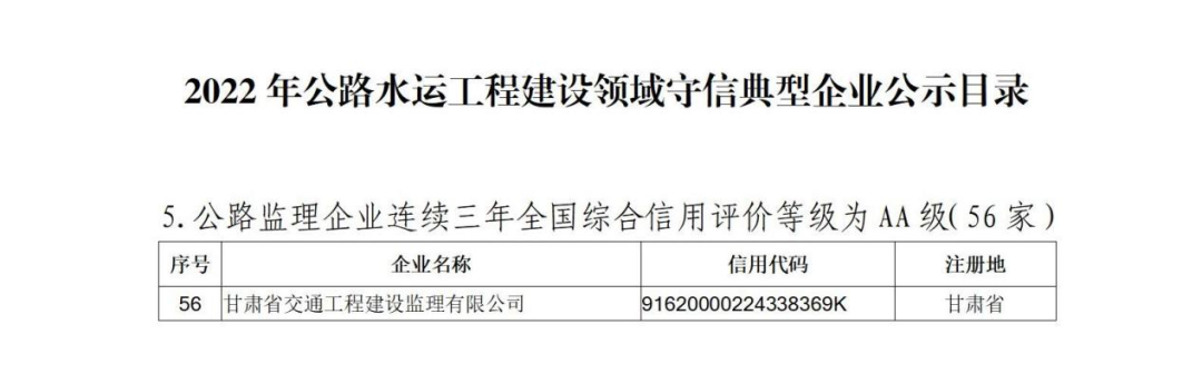 近日,交通運(yùn)輸部公布了《關(guān)于2022年公路水運(yùn)工程建設(shè)領(lǐng)域守信典型企業(yè)目錄的公示》對(duì)獲評(píng)公路水運(yùn)工程建設(shè)領(lǐng)域守信典型的93家設(shè)計(jì)企業(yè)、93家施工企業(yè)、56家監(jiān)理企業(yè)予以公示。甘肅省6家企業(yè)榜上有名,甘肅省交通工程建設(shè)監(jiān)理有限公司是我省唯一一家上榜的監(jiān)理企業(yè)。