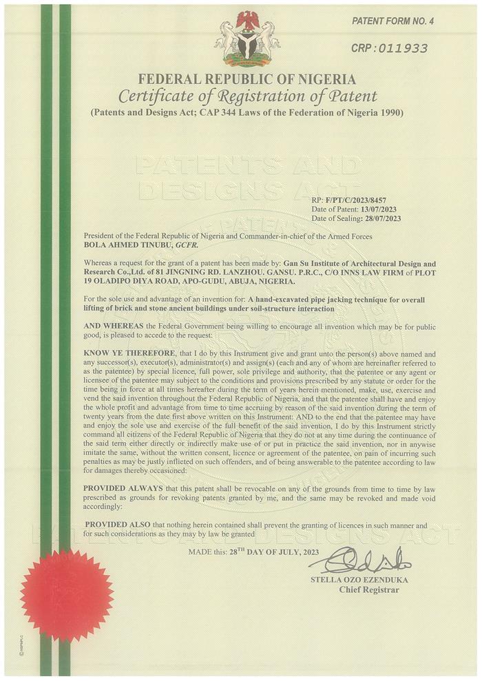 日前,非盟知識(shí)產(chǎn)權(quán)局對(duì)省建筑設(shè)計(jì)院王江龍等申報(bào)的“土-結(jié)構(gòu)相互作用下磚石結(jié)構(gòu)古建筑整體頂升手掘式頂管技術(shù)”(A hand-excavated pipe jacking technique for overall lifting of brick and stone ancient buildings under soil-structure interaction)進(jìn)行授權(quán),為省建筑設(shè)計(jì)院后續(xù)承接援外項(xiàng)目及國(guó)外項(xiàng)目給予了堅(jiān)實(shí)的技術(shù)支撐。