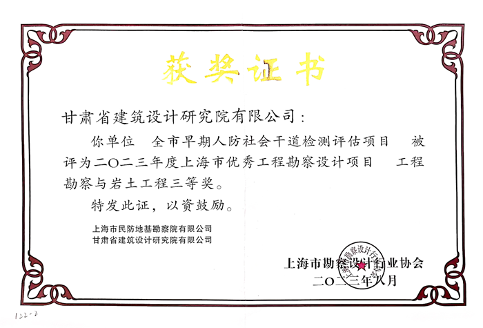 近日,上海市勘察設(shè)計行業(yè)協(xié)會公布了2023年度上海市優(yōu)秀工程勘察設(shè)計項目獎評獎結(jié)果,省建筑設(shè)計院檢測中心提交的“全市早期人防社會干道檢測評估項目”榮獲2023年度上海市優(yōu)秀工程勘察設(shè)計項目工程勘察與巖土工程三等獎。