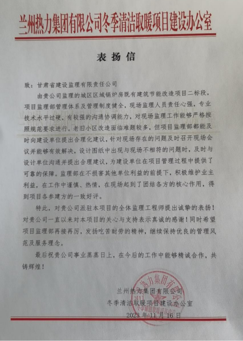 近日,省建設(shè)監(jiān)理公司收到蘭州熱力集團(tuán)有限公司冬季清潔取暖項(xiàng)目建設(shè)辦公室發(fā)來的表揚(yáng)信,對省建設(shè)監(jiān)理公司城區(qū)區(qū)域鍋爐房既有建筑節(jié)能改造項(xiàng)目二標(biāo)段監(jiān)理部全體人員表示感謝。